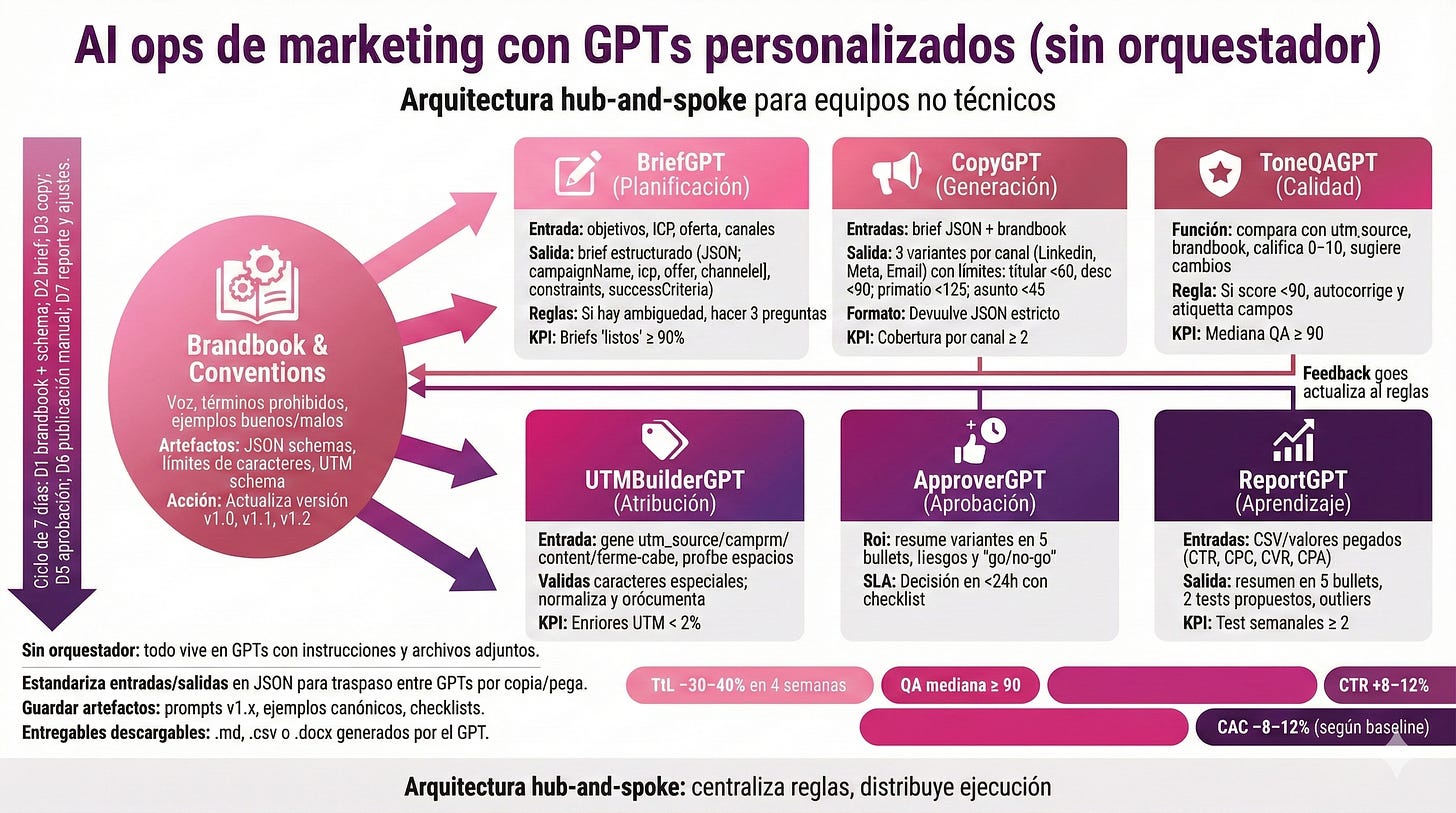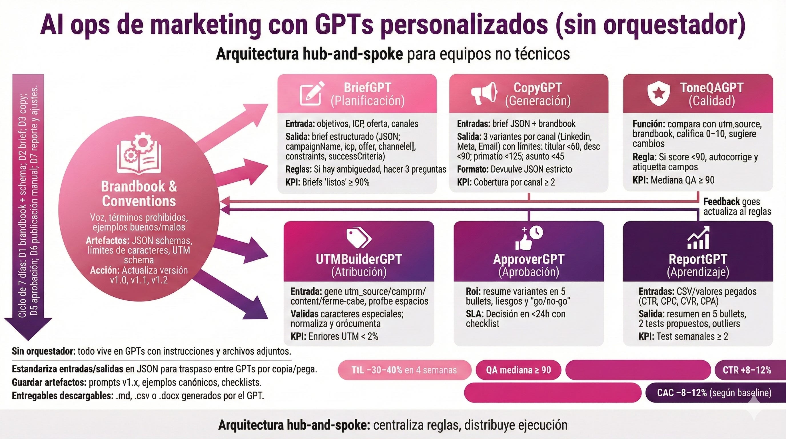 Qué resuelve: ejecución rápida sin orquestador. Centraliza reglas en un brandbook y distribuye tareas entre 6 GPTs (Brief, Copy, QA, UTM, Aprobación, Reporte).
