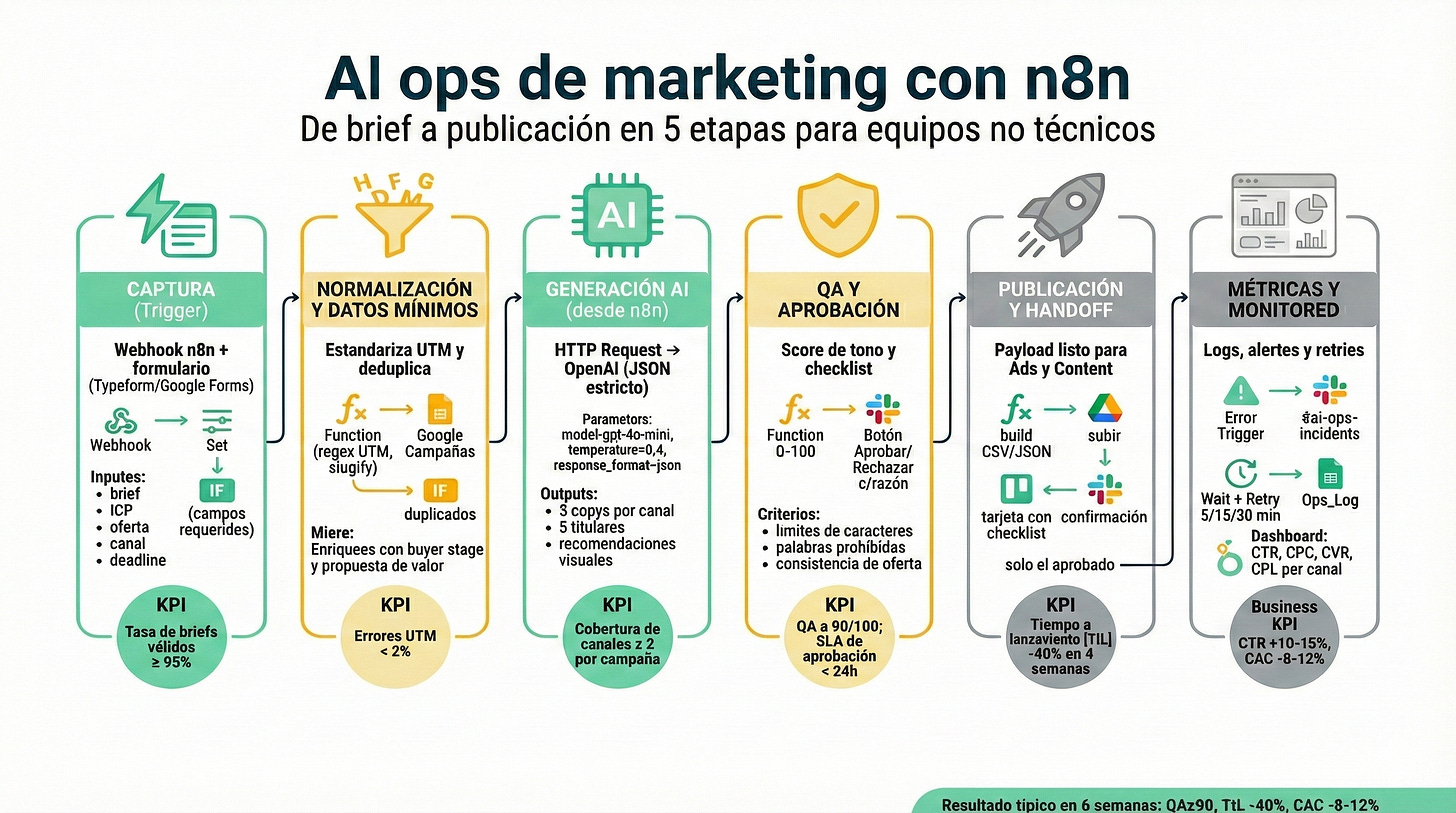 Cómo leerlo: 6 etapas en secuencia. Cada bloque muestra entradas, nodos clave y el KPI que valida la etapa (briefs válidos, QA, TtL).
