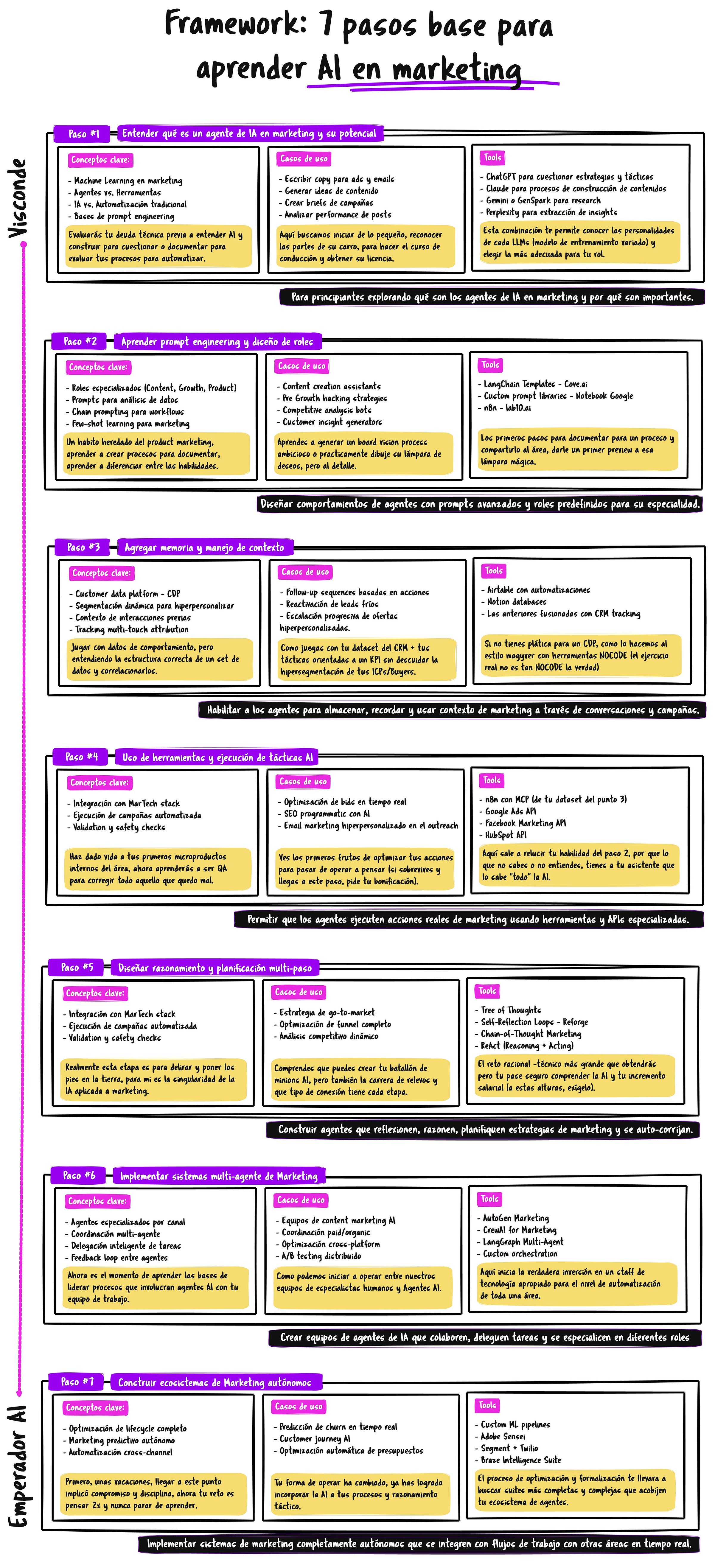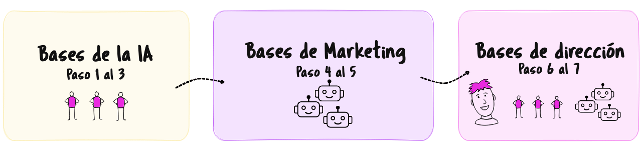 Los 7 pasos tienen su razón de ser; te invitan primero a adaptarte a las bases de la IA, luego a combinarlo con tus conocimientos de marketing para finalizar con el liderazgo del área entre AI y marketing.