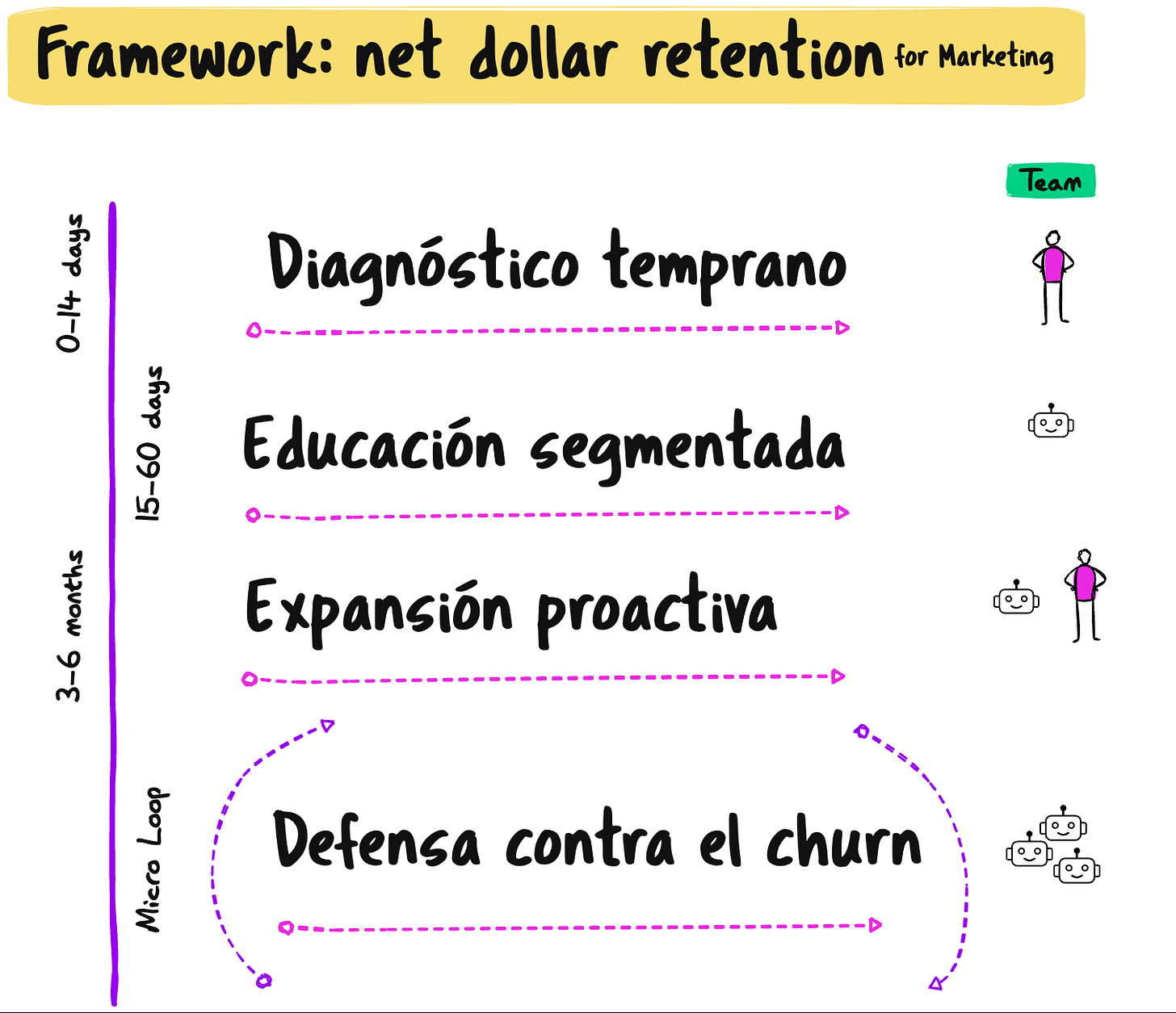 Basado en datos de empresas con NDR > 120% (como Notion, Vercel, y HubSpot), he desarrollado este ciclo de 4 fases aplicable desde el día 1 del onboarding: